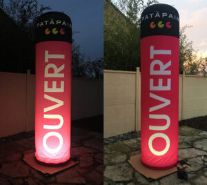 Les colonnes grandes dimensions de 2.5 à 10m de hauteur en gonflage permanent par un ventilateur 220V silencieux qui sont plus généralement utilisé en extérieures.